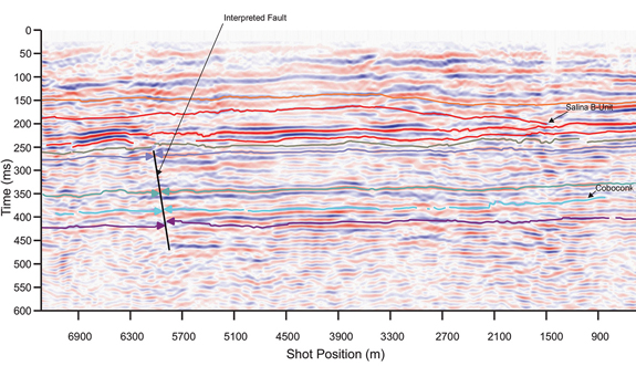 2-D seismic surveys are conducted in areas with sedimentary rock formations such as those found in Ontario’s Bruce County. They are used to generate images of subsurface layers of rock. These studies can show the boundaries between various layers of rock and identify whether those layers are continuous or offset by faults.